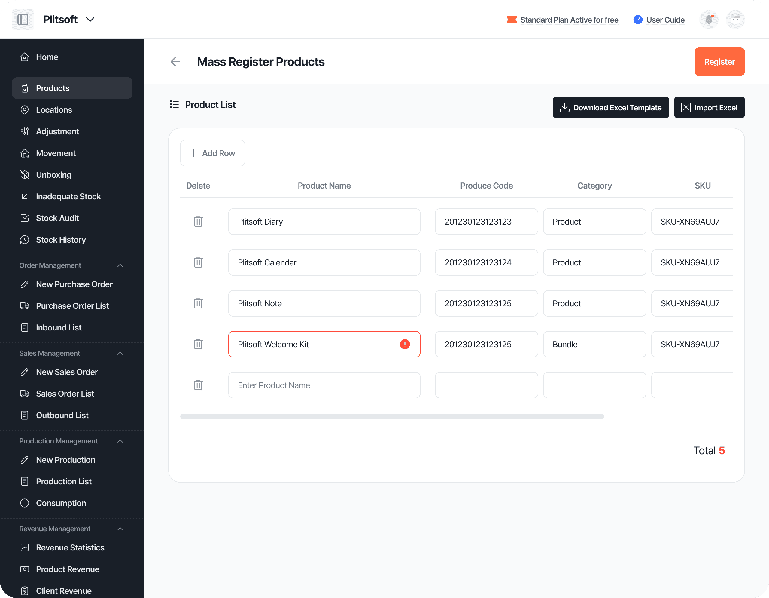 With STOCK 5 MINS AGO, you can input product information into a pre-prepared Excel template and upload it all at once.