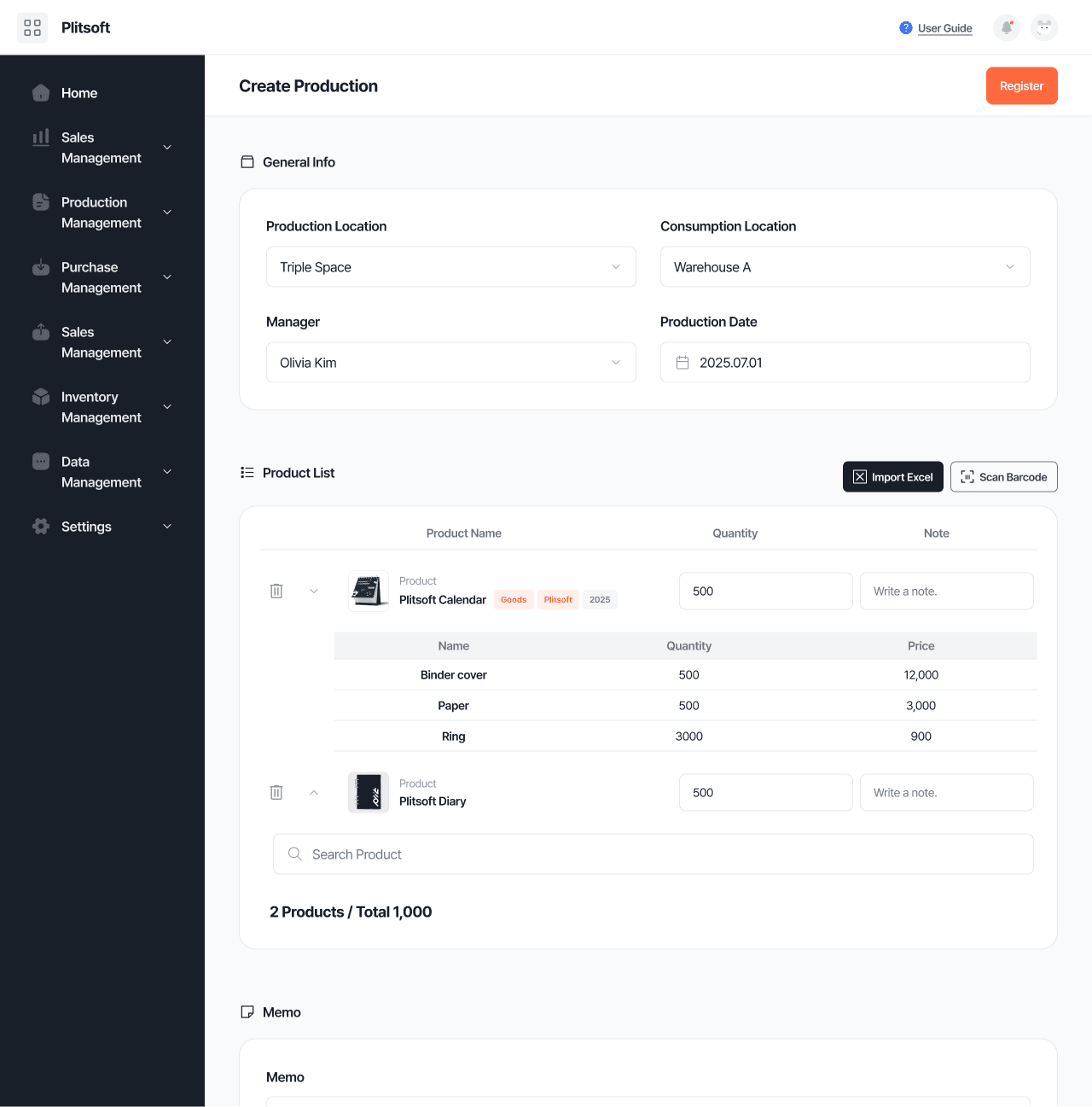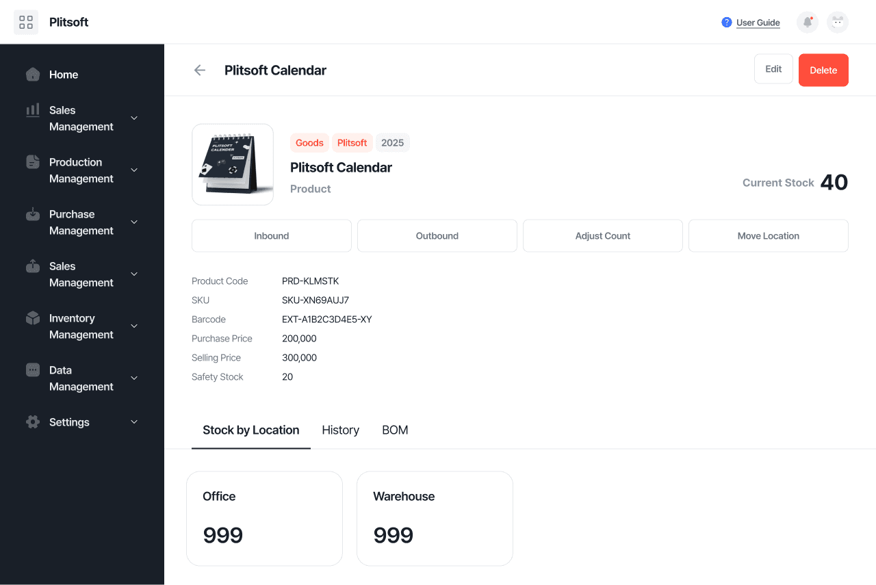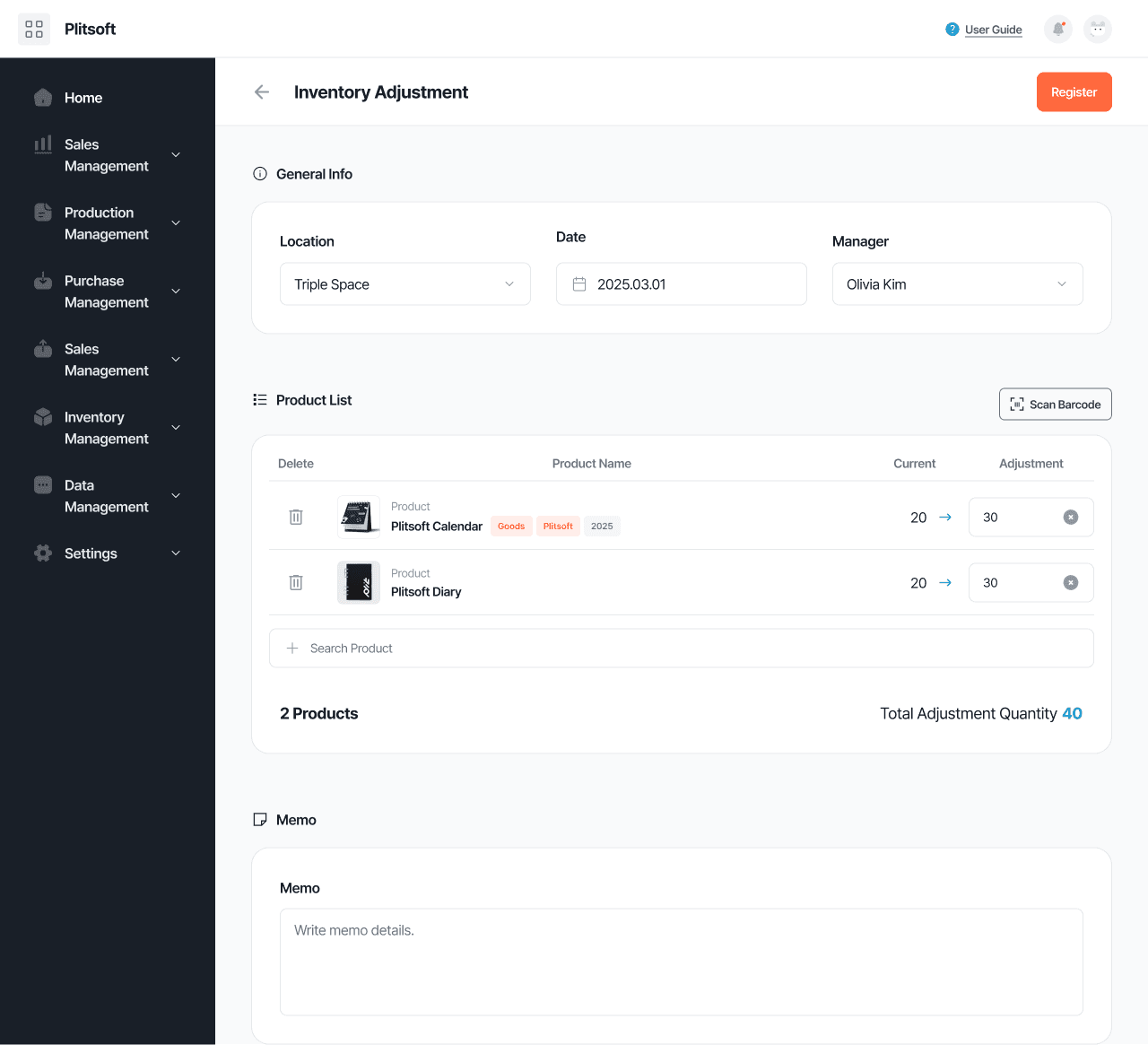 Inventory adjustment, movement, management of stock shortages, registration of obsolete inventory, inventory audits, etc.